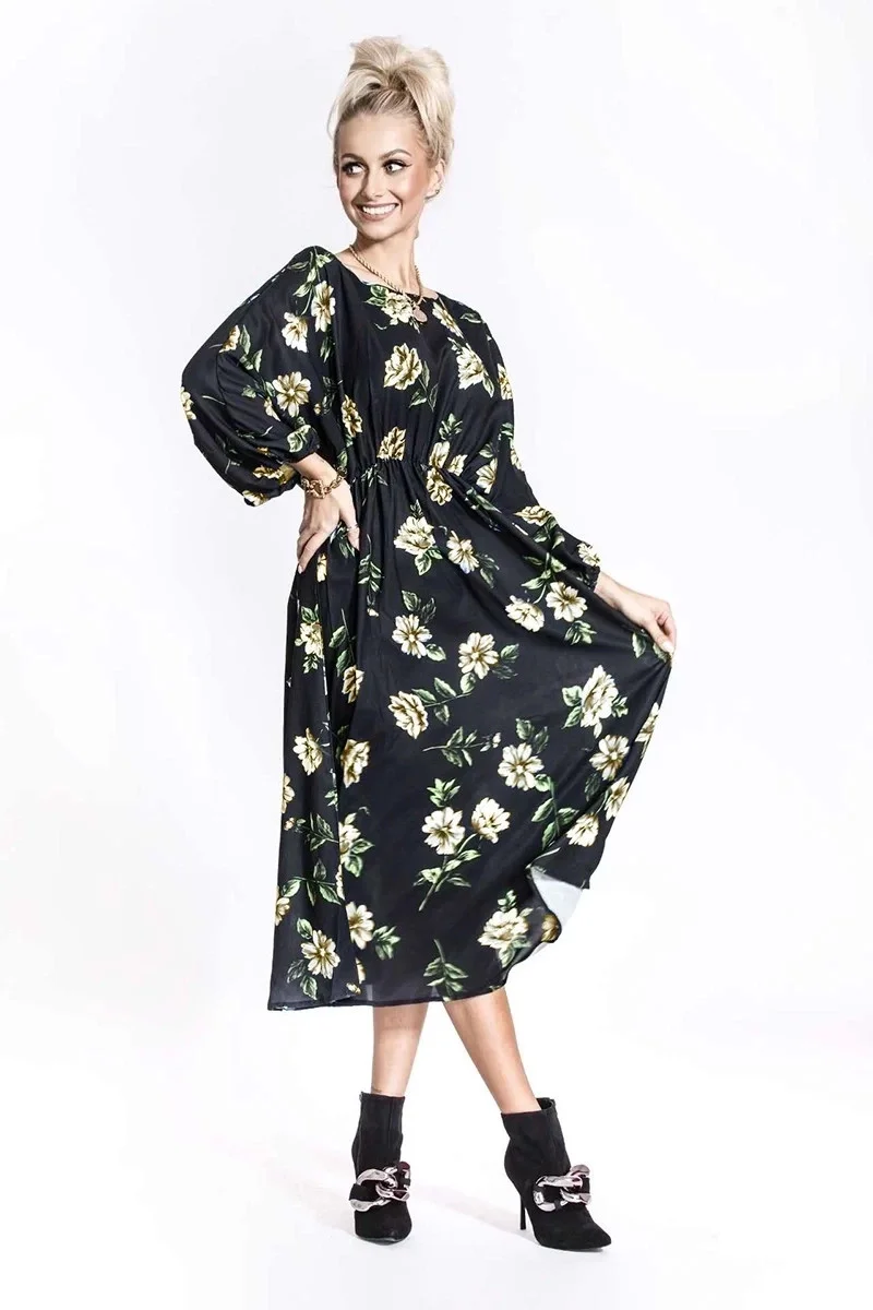 Černo/béžové dámské květaované kimonové šaty s kulatým výstřihem Ann Gissy (XY202116)