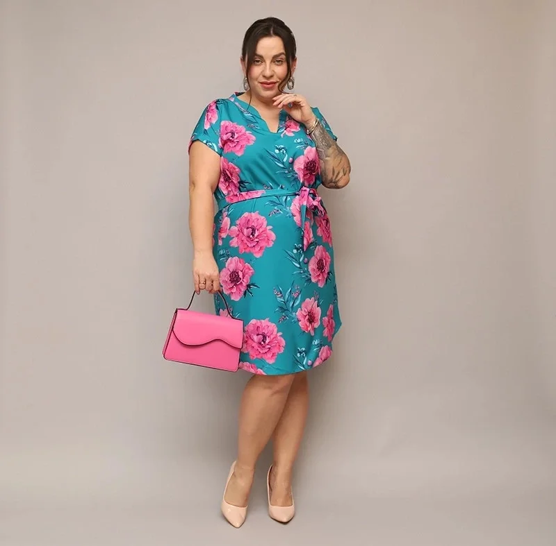 Dámské květované šaty v mořské barvě s páskem (744)