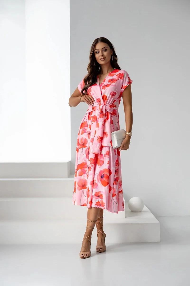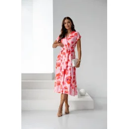 Růžové dámské květované šaty s přeloženým obálkovým výstřihem (82194)