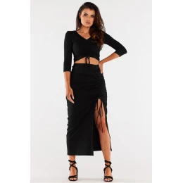 Maxi sukně z měkkého a příjemného úpletu. Řasení od pasu dolů zakončené rozparkem na nohavici v podobě zipu. Střih sukně krásně zvýrazňuje postavu. Navrženo a ušito v Polsku.