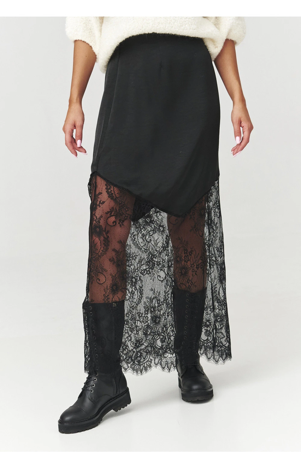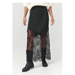 Unikátní černá sukně s krajkovým lemem je návrh pro ženy, které rády spojují eleganci s trochou charakteru. Tento model ohromuje originálním střihem, hladký jemně asymetrický vrch z lehkého polyesteru jemně kontrastuje s efektní krajkou vytvářející jedinečné spojení faktur a stylů. Sukně krásně padne do pohybu a průhledná krajka dodává celku ženský, smyslný akcent. Skvěle se hodí jak do večerních stylizací, tak do každodenních s botami, kozačkami nebo těžší obuví pro módní, lehce rockový efekt. Vyrobeno v Itálii.