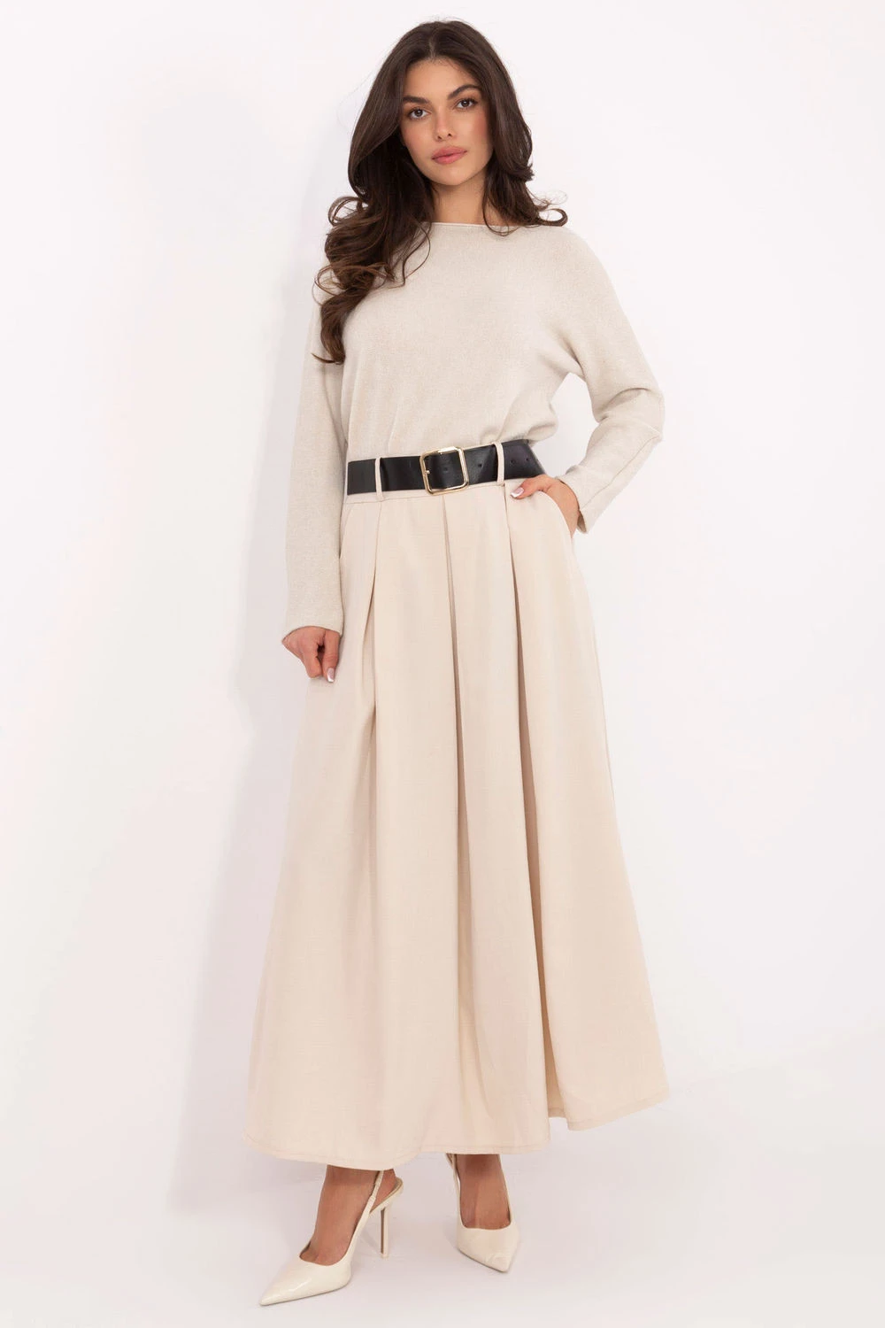Elegantní a ženská dlouhá rozkročná maxi sukně s kontrafałdami vpředu, kombinující pohodlí nošení s klasickým stylem vhodným jak do práce, tak na každodenní vycházky. Vyrobená z vysoce kvalitní směsi viskózy a polyesteru, je lehká, prodyšná a nádherně padne na postavu. Model má vsazený gumový pás vzadu, který zajišťuje ideální přizpůsobení v pasu, a zapínací pásek, který jemně zdůrazňuje postavu. Boční kapsy přidávají funkcionalitu, zatímco kontrafałdy vpředu dávají sukní elegantní, rozkročný tvar. Sukně má hladký vzor, chybí klasické zapínání a maxi délka, díky čemuž je univerzální a snadno stylizovatelná. Ideální volba na každodenní, společenské a elegantní příležitosti, kombinující pohodlí s nadčasovým střihem.