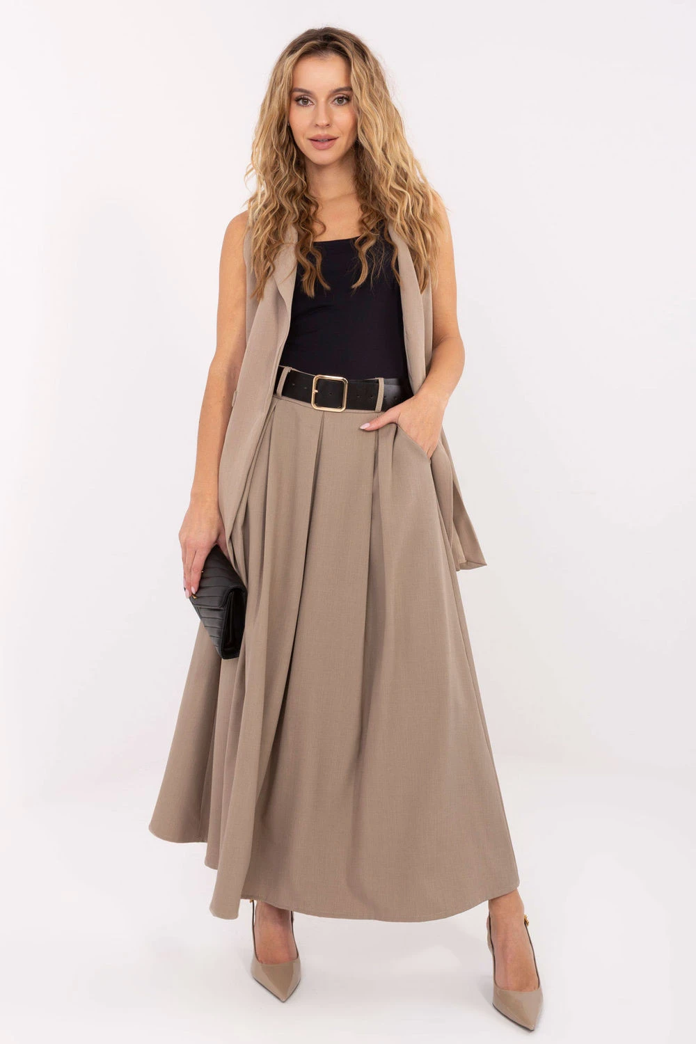 Elegantní a ženská dlouhá rozkročená maxi sukně s kontrafaldami vpředu, kombinující pohodlí nošení s klasickým stylem vhodným jak do práce, tak na každodenní vycházky. Vyrobená z vysoce kvalitní směsi viskózy a polyesteru, je lehká, prodyšná a krásně padne na postavě. Model má vsazený gumový pás vzadu, který zajistí ideální přizpůsobení v pasu, a zapínací pásek, který jemně zdůrazní postavu. Boční kapsy zvyšují funkčnost a kontrafaldy vpředu dodávají sukni elegantní, rozkročený tvar. Sukně má hladký vzor, chybí klasické zapínání a maxi délka, čímž je univerzální a snadno se stylizuje. Je to ideální volba na každodenní, návštěvní a elegantní příležitosti, kombinující pohodlí s nadčasovým střihem.