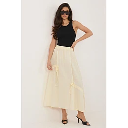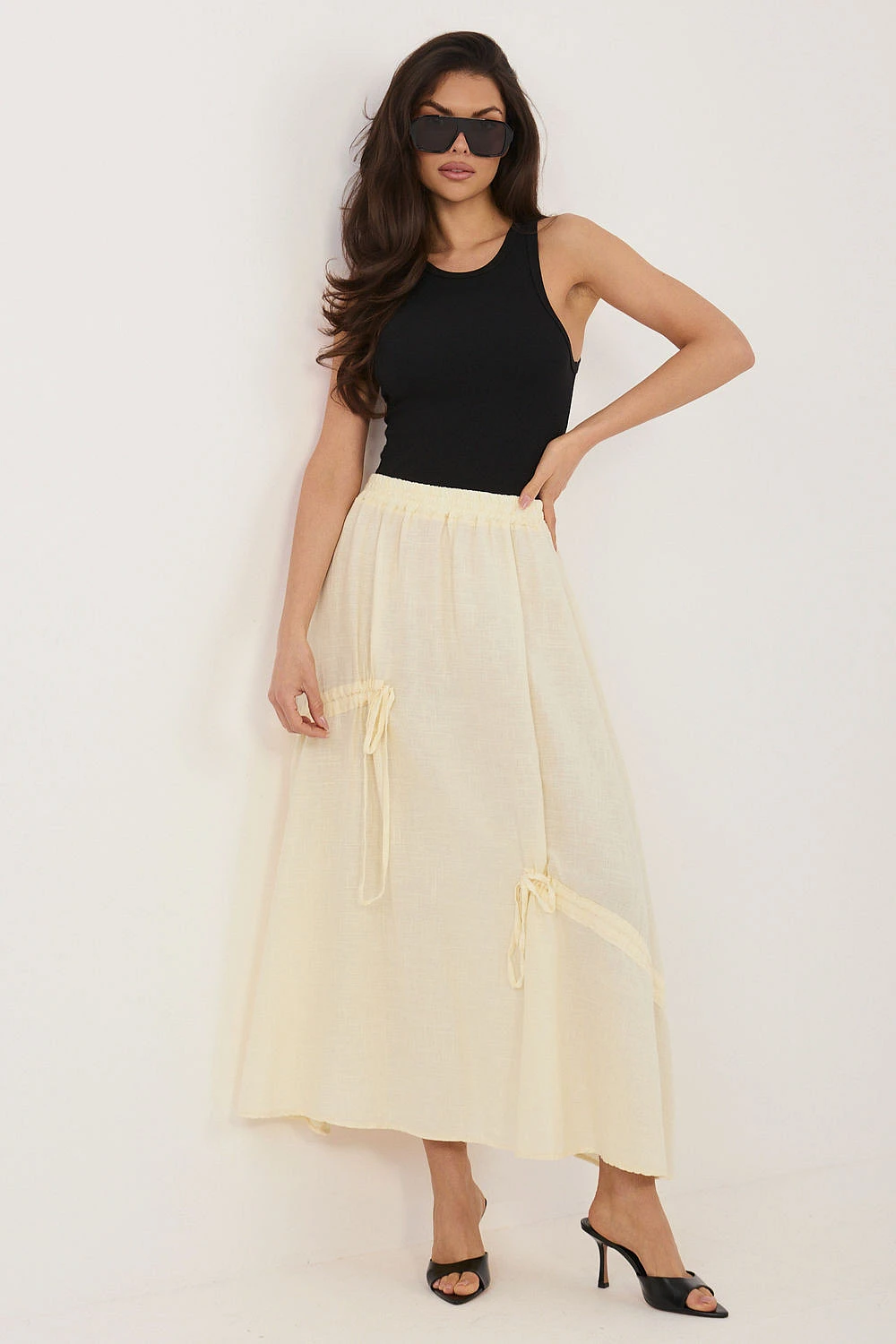Dlouhá dámská sukně v casual stylu, ideální pro každodenní stylizace. Její hladký vzor ji činí univerzální a snadno kombinovatelnou s různými prvky garderoby, od lehkých blůz až po klasické košile nebo topy. Model byl vyroben z vysoce kvalitní směsi lyocellu, bavlny a lnu, díky čemuž je materiál lehký, prodyšný a příjemný na nošení. Přírodní vlákna zajišťují, že sukně je vynikající zejména v teplejších dnech, poskytující komfort po celý den. Sukně má elastickou gumu všitou v pase, která zaručuje pohodlné přizpůsobení postavě a volnost pohybu. Absence klasického zapínání činí model snadným a rychlým na oblékání. Ozdobné šněrování vpředu dodává celku jemný, ženský charakter a představuje stylový akcent dokončení.