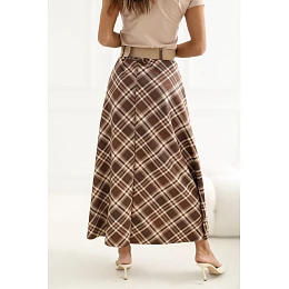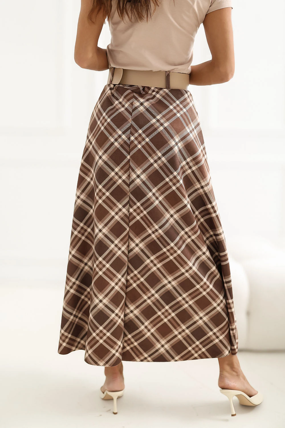 Elegantní maxi sukně s rozkrokovým střihem, která se skvěle hodí jak do každodenních outfitů, tak do pracovních setů. Model se vyznačuje klasickým vzorem v kostkovaném stylu, který dodává celku elegantní a nadčasový charakter. Sukně má pohodlný elastický pásek, díky kterému se dobře přizpůsobuje postavě a poskytuje pohodlí po celý den. Dalším prvkem je zapínací pásek, který zdůrazňuje pas a je stylovým doplňkem modelu. Délka maxi a rozkrokový střih zajišťují, že sukně krásně padne během pohybu, dodávají outfitu lehkost a ženský charakter. Vyrobená z materiálu kombinujícího polyester a elastan, je odolná, lehce elastická a pohodlná při nošení. Model bez zapínání zajišťuje rychlé a snadné oblékání.