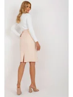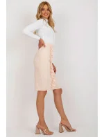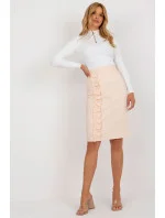Elegantní tužková sukně s vyšším pasem, zapínaná na krytý zip. Sukně ze zajímavě strukturované látky s podšívkou, na přední straně ozdobný volán.