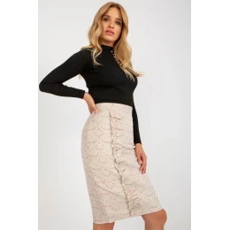 Elegantní tužková sukně s vyšším pasem, zapínaná na krytý zip. Sukně ze zajímavě strukturované látky s podšívkou, na přední straně ozdobný volán.