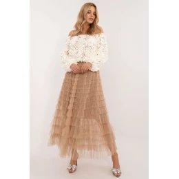 Elegantní tylová sukně s volány je stylovým návrhem jak na každodenní nošení, do práce, tak i na slavnostní příležitosti nebo večírky. Vyrobená z lehkého polyesteru, má hladký vzor a délku midi, co jí dodává ženský a elegantní vzhled. Jemné volány dodávají sukní romantický charakter a zdůrazňují její elegantní styl. Bez zapínání a elastický pas zajišťují pohodlí nošení, a podšívka zaručuje komfort a zabrání průsvitu. Jedinečná sukně, která spojuje jemnou eleganci s praktičností, je ideální na různé příležitosti.