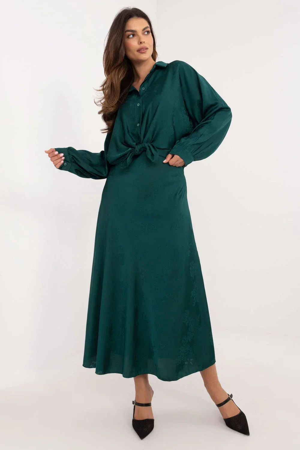 Tato jedinečná sukně kombinuje klasiku s moderností. Vyrobená z vysoce kvalitního materiálu, kombinace polyesteru a elastanu, která imituje satén, zaručuje pohodlí a skvělé padnutí. Jemný vzor vyšívaných květů jí dodává jemnost a dělá ji ideální jak na každý den, tak na speciální příležitosti. Midi délka dodává sukní eleganci a absenci zapínání ji činí velmi pohodlnou na nošení. Skvěle zdůrazňuje pas a přidává ženskost. Tato sukně je investicí do vašeho šatníku. Její univerzální střih a elegantní vzor vám zajistí sebevědomí a styl ve každé situaci. Je to kousek, který by měl být ve skříni každé ženy, která si váží klasiky a pohodlí.