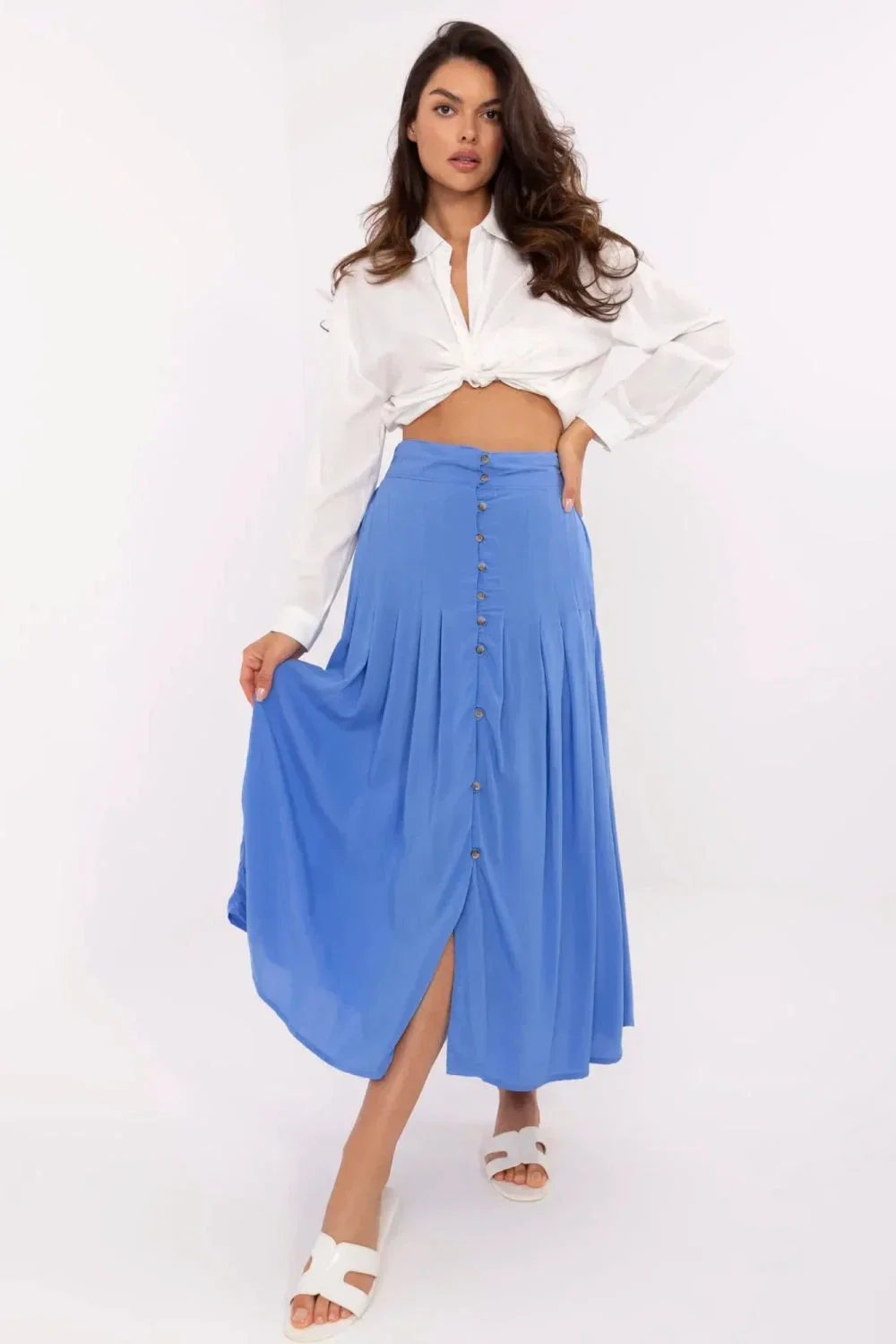 Elegantní, plisovaná midi sukně je skvělým návrhem na každý den i do práce. Vyrobená z ekologické viskózy spojuje módní vzhled s pohodlím nošení a ohleduplností k životnímu prostředí. Model s hladkým dokončením a ozdobnými knoflíky vpředu vypadá elegantně a moderně. Plisování dodává lehkost a elastický pásek na zádech zajistí pohodlné přizpůsobení se postavě. Skrytý zip na boku usnadňuje oblékání a neporušuje linie střihu. Jedná se o univerzální a ženskou sukni, která se skvěle hodí do každodenních i pracovních stylizací.