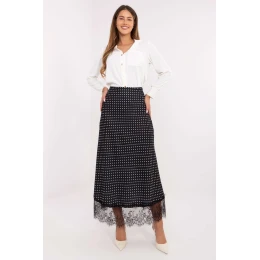 Elegantní a ženská sukně midi délky, vyrobená z příjemného na dotek materiálu, polyesteru s přídavkem elastanu, který zajišťuje pohodlí nošení a ideální přizpůsobení postavě. Model je zdoben jemnou krajkou na spodní části, což mu dodává eleganci a jemný charakter. V pasu je vsazena elastická guma, díky čemuž se sukně skvěle přizpůsobuje pasu a není zapínána. Materiál je zdoben moderním puntíkatým vzorem, který celému kusu dodává lehkost a kouzlo. Jedná se o univerzální model, který se hodí jak na každodenní nošení, do práce, tak i na slavnostní příležitosti.