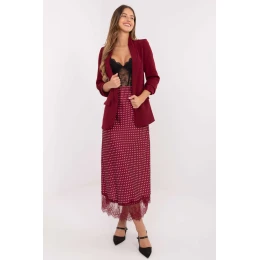 Elegantní a ženská sukně midi délky, vyrobená z příjemného na dotek materiálu, polyesteru s přídavkem elastanu, který zajišťuje pohodlí při nošení a ideální přizpůsobení postavě. Model je zdoben jemnou krajkou na spodku, co mu dodává elegance a jemný charakter. V pasu je vsazena elastická guma, díky čemuž se sukně skvěle přizpůsobuje pasu a není třeba ji zapínat. Materiál zdobí módní puntíkovaný vzor, který celku dodává lehkost a šarm. Jedná se o univerzální model, který se hodí jak na každý den, do práce, tak i na slavnostní příležitosti.