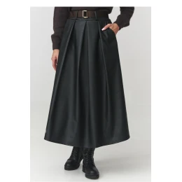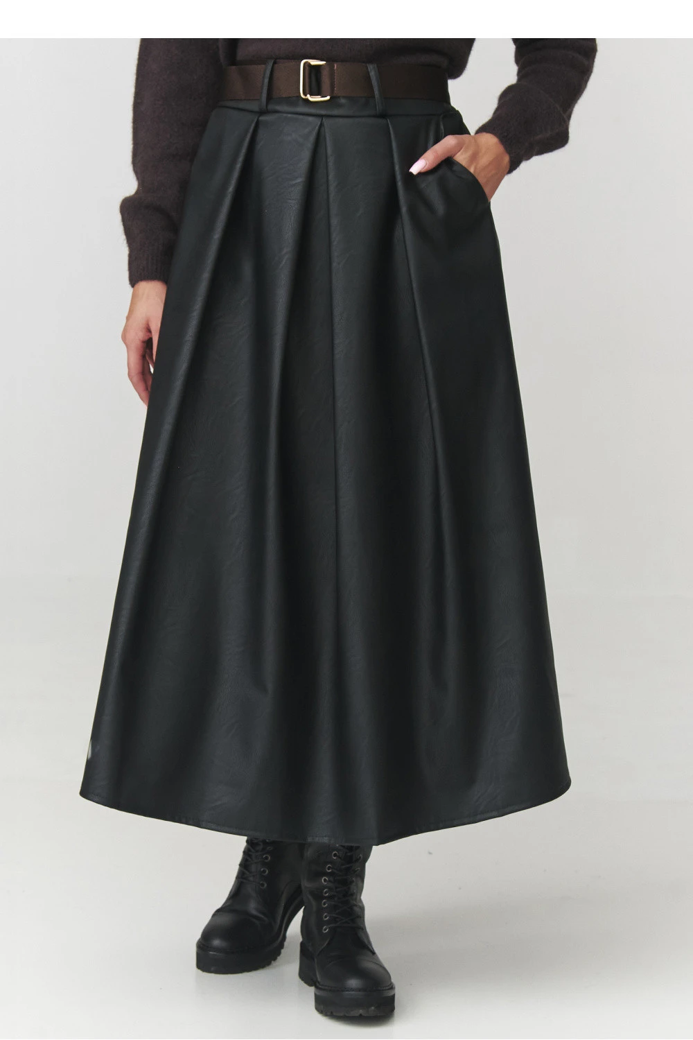 Elegantní černá kožená sukně je naprostý must-have v ženském šatníku! Vyrobená z měkkého, příjemného na dotek materiálu imitujícího kůži, vypadá elegantně a moderně. Sukně má rozšířený střih midi, který se krásně pohybuje a zdůrazňuje postavu. Součástí je módní pásek s přezkou, který zdůrazňuje pas a dodává celku charakter. Je to ideální volba jak na každý den, tak na speciální příležitosti, skvěle vypadá s přiléhavým rolákem, košilí nebo oversized svetrem. Díky své univerzálnosti se hodí k botkám, kozačkám nebo klasickým lodičkám. Vyrobeno v Itálii.