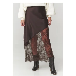 Vsadte na styl, který spojuje ženskost s moderním charakterem. Asymetrická sukně s jemným krajkovým výstřihem je model, který přitahuje pohledy a dodává sebevědomí. Hladká tkanina v horní části krásně kontrastuje s jemnou krajkou dole, vytvářející efekt lehkosti a výjimečné elegance. Ideální jak pro těžké boty, tak pro ženské špičky, hodí se do mnoha stylizací, od každodenních po večerní. K dispozici ve dvou barvách: klasickém černém a hlubokém odstínu čokolády. Díky elastickému pasu skvěle padne k postavě. Vyrobeno v Itálii.