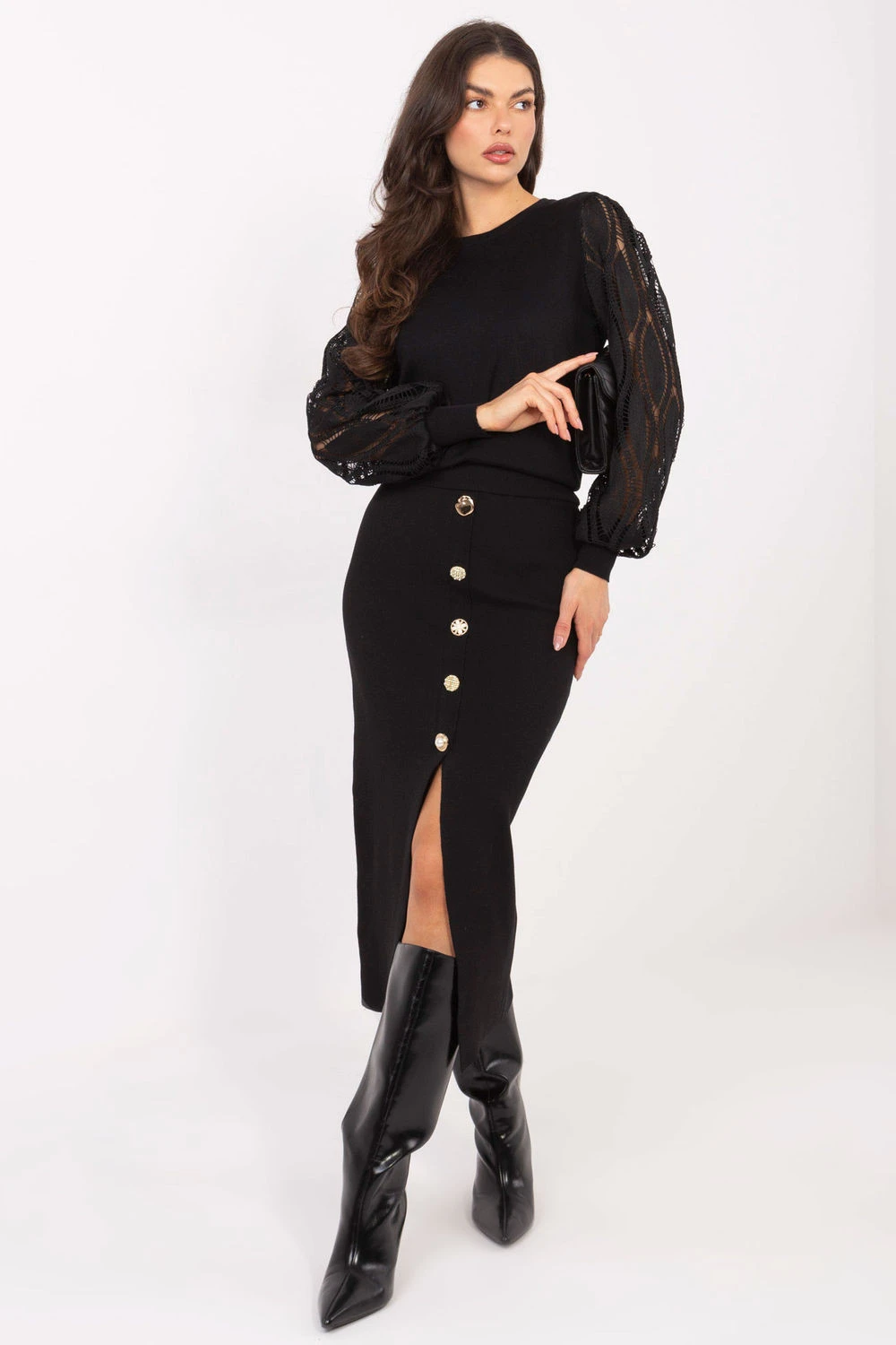 Elegantní pletená sukně s hladkým vzorem, navržená s ohledem na univerzální použití, ideální na významné události, do práce i každodenního nošení. Vyrobená z vysoce kvalitní směsi viskózy a polyesteru, poskytuje měkkost, pohodlí a jemnou pružnost. Model s midi délkou se krásně skládá na postavě, a gumový pas zajišťuje pohodlné přizpůsobení a volnost pohybu. Sukně nemá zapínání, což dále zvyšuje pohodlí nošení. Na přední straně jsou ozdobné knoflíky, které dodávají celku elegantní charakter. Další výhodou je rozpark u spodní části vpředu, jemně zdůrazňující linii nohou a poskytující větší volnost při chůzi. Jedná se o stylový a funkční model pro ženy, které oceňují klasiku, pohodlí a nadčasovou eleganci.