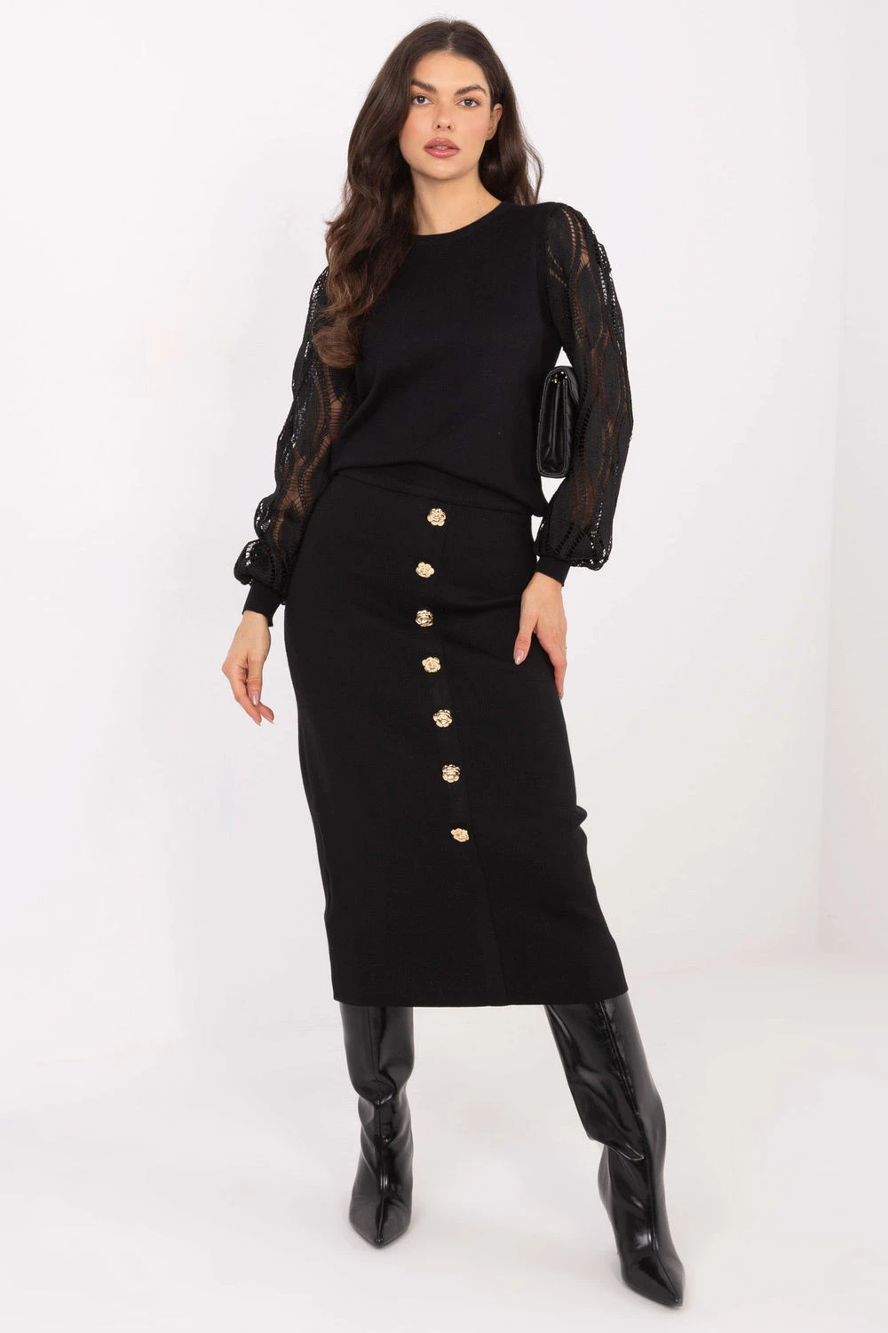 Elegantní úpletová suknička s hladkým vzorem, skvělá na každý den, do práce, ale i na více společenské příležitosti. Vyrobená z vysoce kvalitní směsi viskózy a polyesteru, zaručuje pohodlí nošení, jemnost a jemnou pružnost, skvěle se přizpůsobuje postavě. Model midi délky představuje nadčasový, klasický styl. V pasu je vsazena gumová pásek, díky které suknička perfektně sedí a zajišťuje pohodlí po celý den. Bez zapínání je velmi praktická a snadno se obléká. Na přední straně jsou umístěny ozdobné knoflíky, které dodávají celku eleganci a jemně zdůrazňují minimalistický střih. Ideální volba pro ženy, které ocení kombinaci elegance, pohodlí a univerzálního stylu.