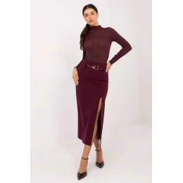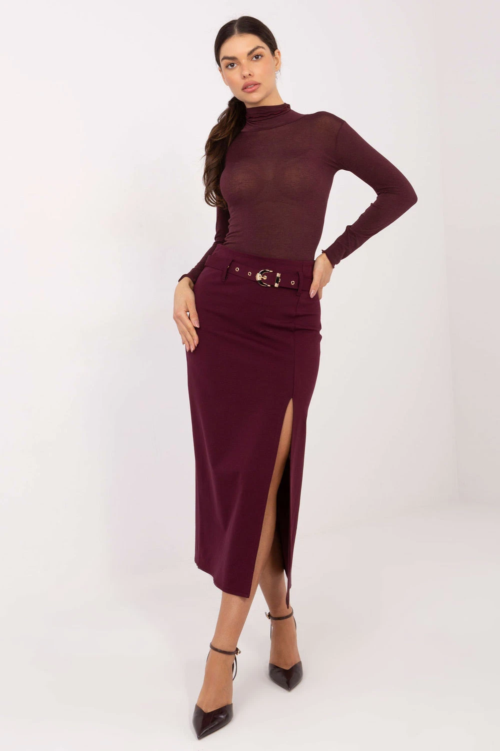 Elegantní, elegantní midi sukně, ideální na návštěvy, večírky a večerní vycházky. Vyrobeno z směsi viskózy a nylonu, díky čemuž je materiál příjemný na dotek, lehce pružný a krásně padne na postavě. Dominantní hladký vzor zdůrazňuje klasický, nadčasový charakter modelu. Sukně má rozparek vpředu, který jí dodává moderní ženský akcent a zároveň poskytuje volnost pohybu. V pase je zapínací pásek, který umožňuje perfektní přizpůsobení a zdůrazňuje ženskou siluetu. Celkově je sukně uzavřena na skrytý zip, zachovávající elegantní, minimalistický vzhled.