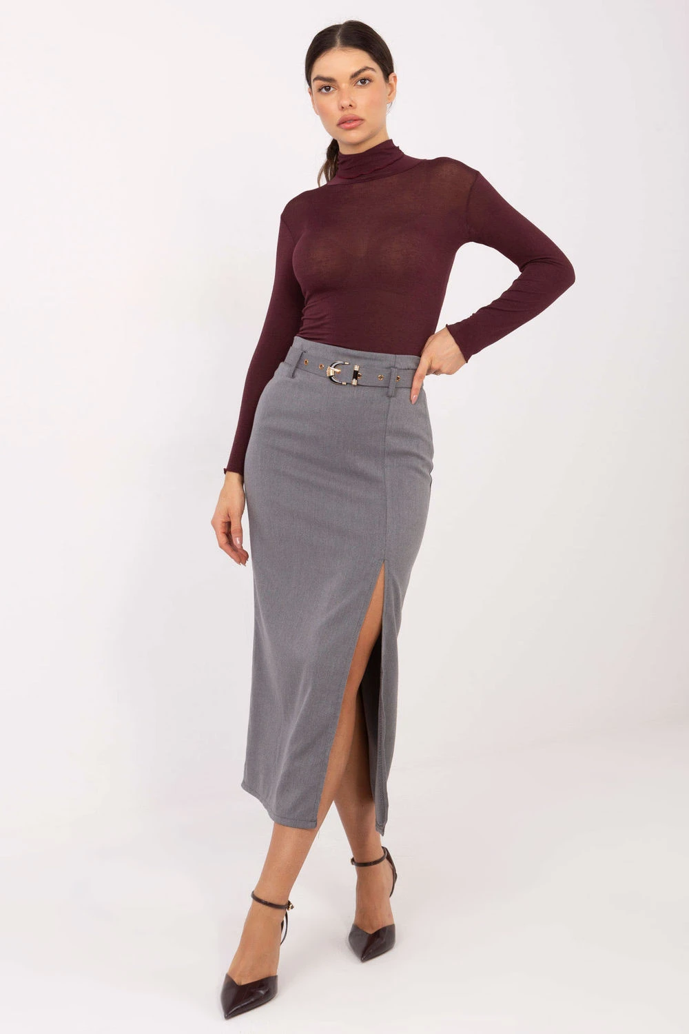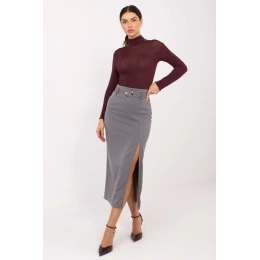 Elegantní, stylová sukně midi délky, ideální na slavnostní události, večerní akce a večírky. Vyrobená z kombinace polyesteru, elastanu a viskózy, díky čemuž je materiál příjemný na dotek, lehce elastický a krásně padne na postavě. Hladký vzor podtrhuje klasický, nadčasový charakter modelu. Sukně má rozparkem vpředu, který jí dodává moderní, ženský nádech a zároveň zajišťuje pohodlí při pohybu. V pase je zapínací pásek, který umožňuje ideální přizpůsobení a zdůrazňuje ženskou siluetu. Celkový vzhled je elegantní a minimalistický s krytým zipem.
