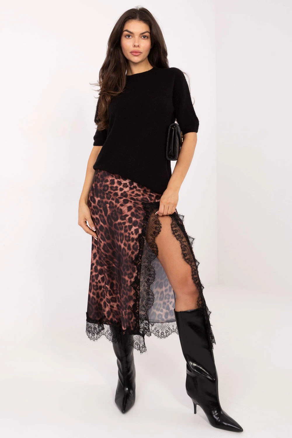 Elegantní saténová sukně je stylovým návrhem, který se skvěle hodí jak do každodenních stylizací, tak i na slavnostní události a do práce. Efektní zvířecí motiv jí dodává výrazný, módní charakter, zdůrazňující individuální styl. Model má elastický pásek, který zajišťuje pohodlné nošení a ideální přizpůsobení postavě. Rozpark na přední straně sahající k stehnu jemně exponuje nohu, přidávajíc celku ženskou lehkost a eleganci. Celkový vzhled je doplněn jemným lemováním z krajky, které představuje výjimečný, dekorativní akcent. Sukně je vyrobena z vysoká kvality směsi polyesteru, viskózy a elastanu, díky čemuž je materiál lehký, příjemný na dotek a jemně elastický. Chybějící zapínání zdůrazňuje minimalistický tvar a pohodlí užívání.