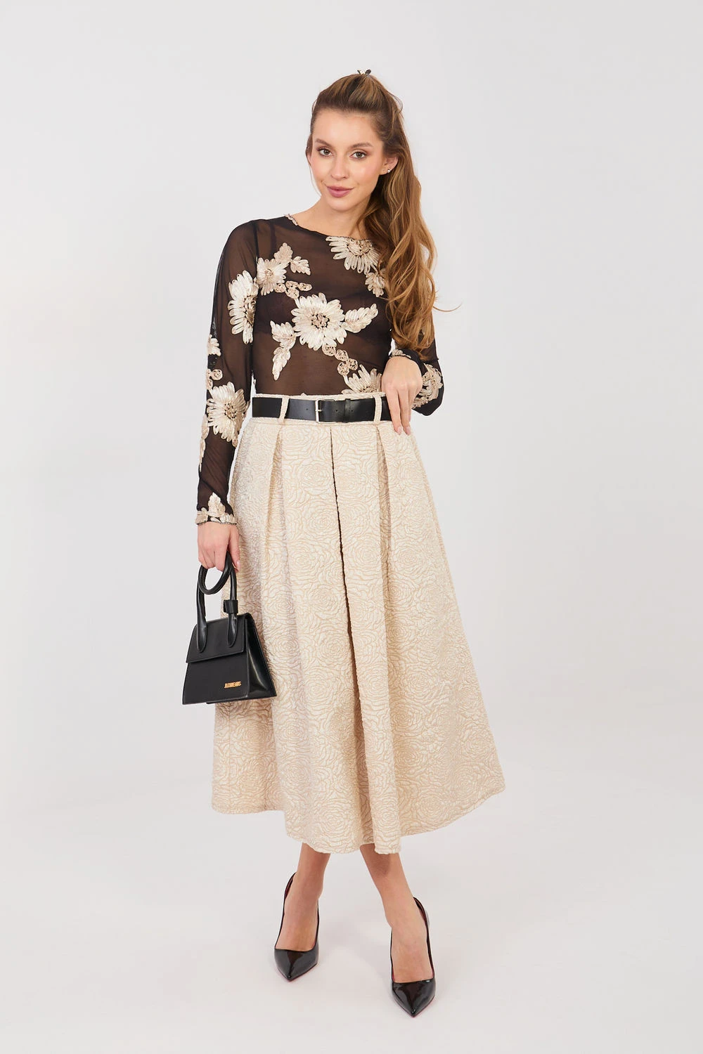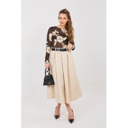 Tato rozšířená střední sukně je skvělým návrhem pro ženy, které ocení eleganci spojenou s pohodlím nošení. Klasický střih krásně padne na postavě, zdůrazňuje pas a dodává lehkost každému pohybu. V pase je vsazena elastická guma pro pohodlné přizpůsobení bez nutnosti zapínání. Dekorativní záhyby vpředu dodávají sukní zvláštní charakter a jemný květinový vzor a různorodá struktura materiálu vnášejí do oblečení nádech ženské elegance. Model se skvěle hodí jak do společenských stylizací, tak i do práce s košilí, blůzou nebo sako. Další výhodou jsou praktické kapsy a zapínací pásek, který zdůrazní pas a dodá celku propracovaný vzhled. Jedná se o sukně, která spojuje klasickou eleganci s každodenním pohodlím. Ideální do kanceláře, na setkání a slavnostní příležitosti vždy, kdy chcete vypadat stylově a cítit se pohodlně.