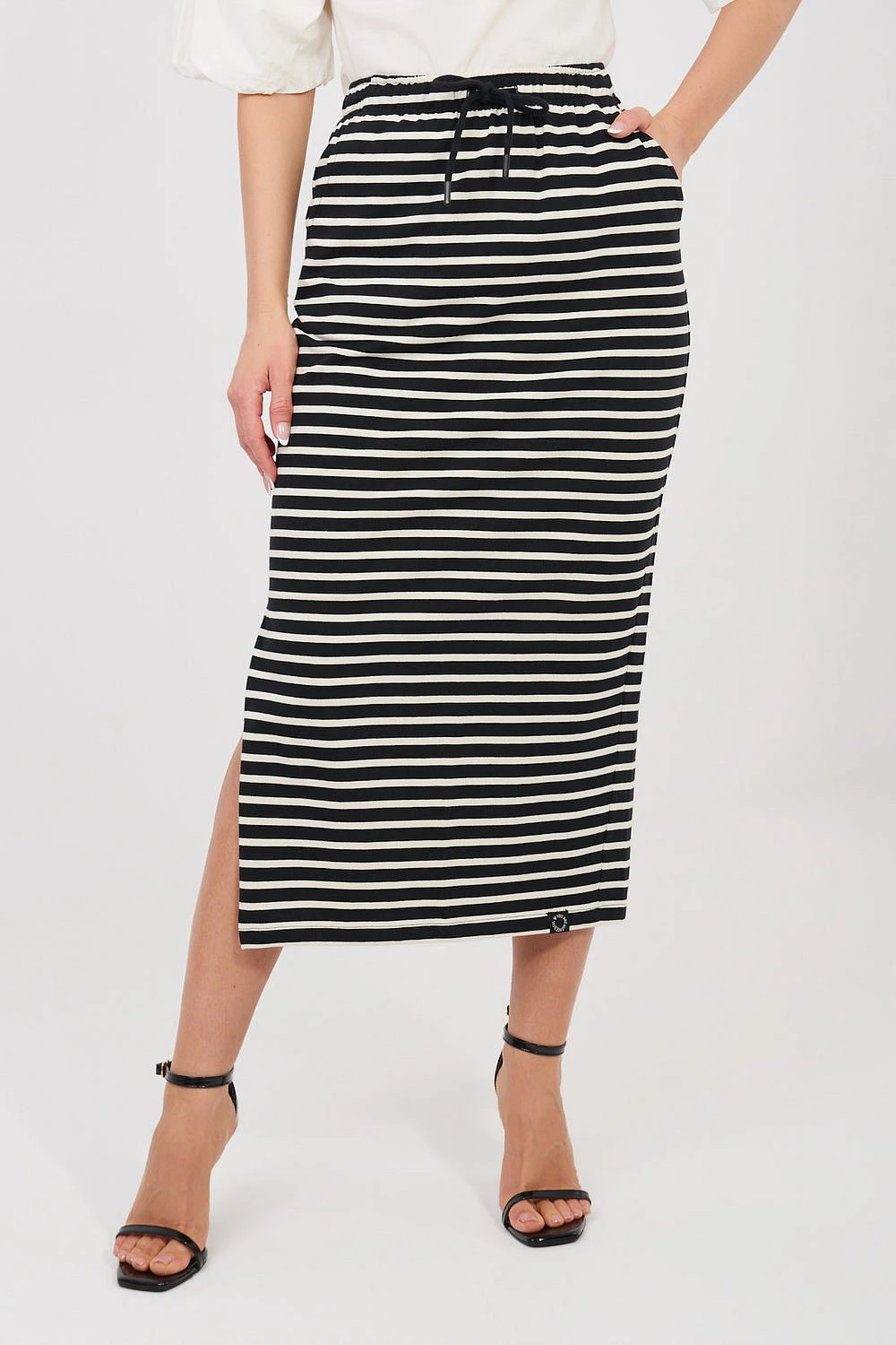 Stylová dámská sukně v casual stylu je ideální volbou pro každodenní outfit. Bude skvěle vypadat jak při procházce, nákupu, tak i setkání s přáteli, poskytující pohodlí a módní vzhled. Model je vyroben z vysoce kvalitní bavlny, díky čemuž je materiál prodyšný, příjemný k pokožce a pohodlný na nošení po celý den. Sukně má midi délku, která jí dodává univerzální a ženský charakter. V pasu je vsazena elastická guma, která zajišťuje dobré přizpůsobení postavě a pohodlí při nošení. Dalším prvkem je šňůrka v pase, která má dekorativní funkci a zdůrazňuje pas. Celý vzhled ozdobuje módní pruhovaný vzor, který dává sukni lehkost a letní styl. Model je také vybaven praktickými kapsami, které zvyšují funkcionalitu. To je skvělá volba pro každodenní outfit, spojující pohodlí s nadčasovým vzhledem.