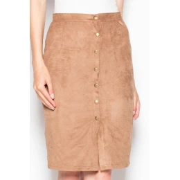 Módní tužková sukně v midi délce ze semiše. Charakteristickým znakem sukně je řada ozdobných knoflíků, které se táhnou po celé délce sukně.