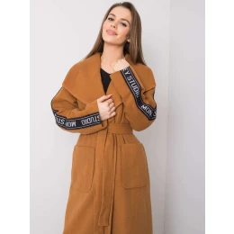 Světle hnědý dámský kabát s páskem.