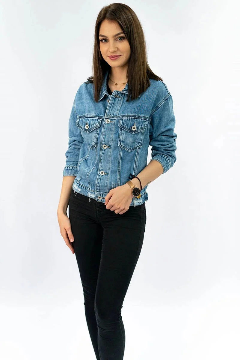 Bunda má volný střih, límeček, dvě kapsy a zapíná se knoflíky. Model zdobí módní protržení.