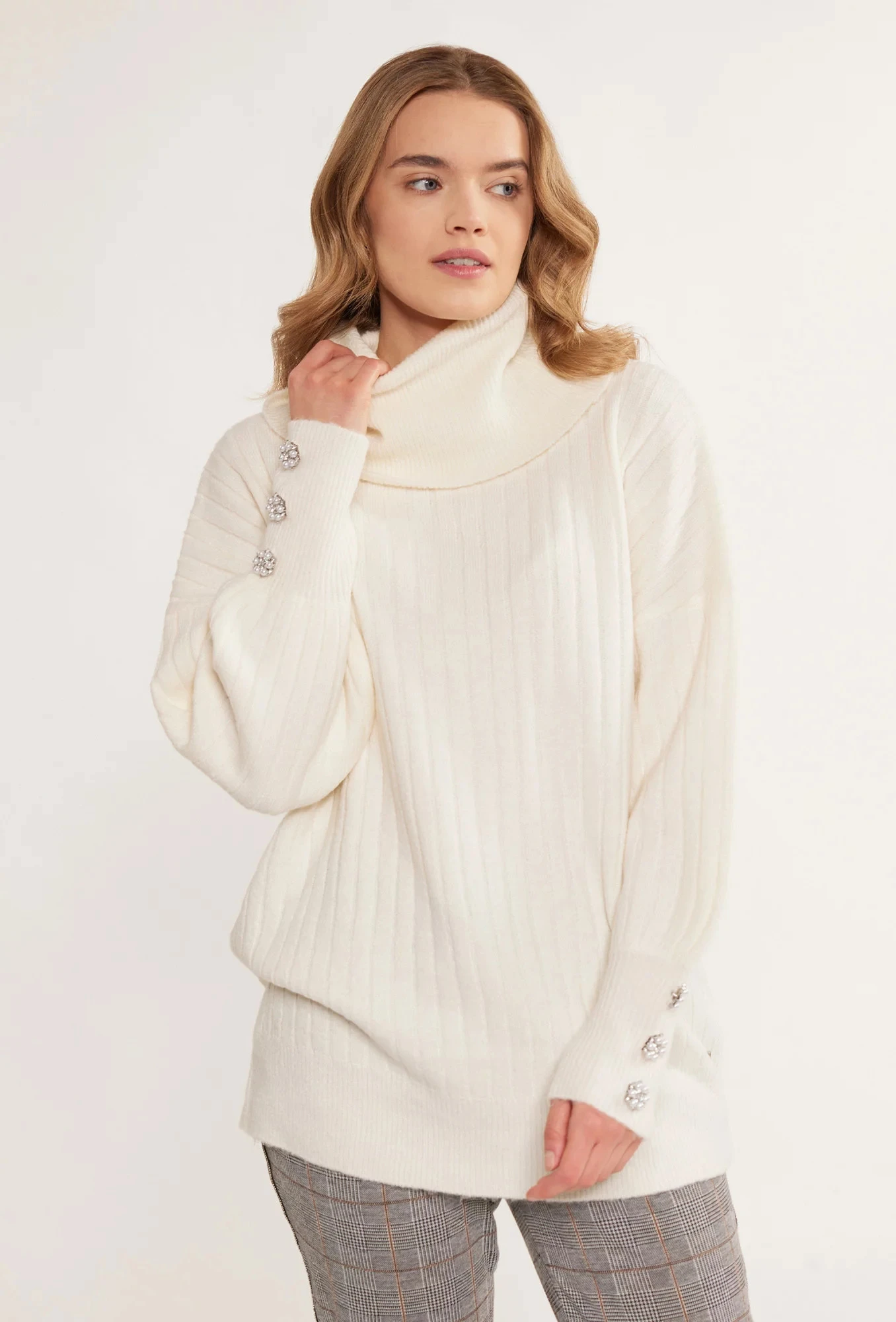 Dámský rolák volného střihu s ozdobným prošitím, vyrobený z materiálu příjemného na dotek. Golf s dlouhými, mírně nadýchanými rukávy s bižuterními knoflíky na koncích. Tento model bude jistě fungovat i v chladném počasí. Modelka na obrázku je 177 cm vysoká a má velikost 36.