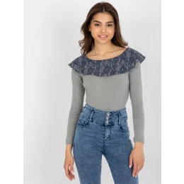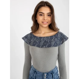 Šedomodrá halenka s lodičkovým výstřihem na šněrování.