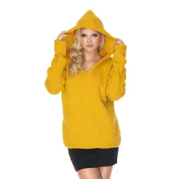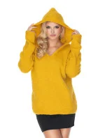 Měkký a volný svetr s kapucí. Svetr s výstřihem do V a šňůrkou na stažení ve spodní části.