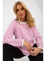 Dámský svetr klasického střihu s barevnými pruhy, dlouhými rukávy a kulatým výstřihem.