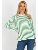 Dámský svetr klasického střihu s barevnými pruhy, dlouhými rukávy a kulatým výstřihem.