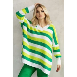 Volný svetr s dlouhými rukávy a výstřihem do V. Svetr se zajímavými barevnými pruhy.