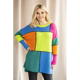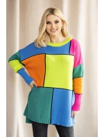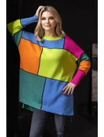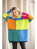 Volný svetr s dlouhými rukávy, zastrčený přes hlavu. Zadní část svetru je mírně delší. Svetr s barevným blokovým vzorem.