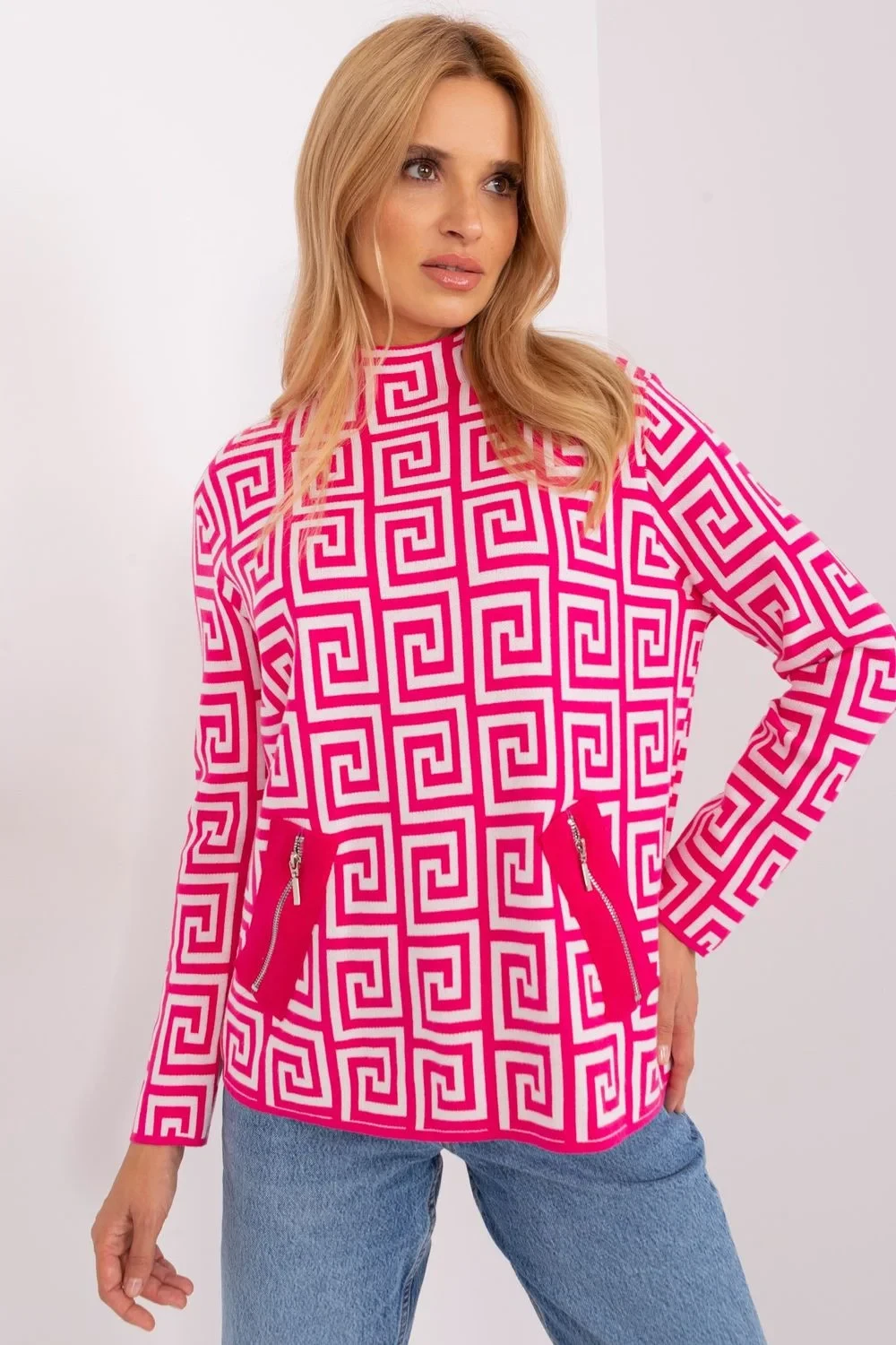 Tento dámský svetr je ideální volbou pro každodenní nošení do práce. Jeho dlouhý rukáv a poloviční rolák vás udrží v teple a pohodlí i v chladnějších dnech. Svetr má geometrický vzor, který mu dodává originalitu a styl. Je ideální volbou pro ty, kteří ocení módní vzhled. Délka svetru je standardní, díky čemuž se hodí k mnoha různým stylům. Kapsy na zip jsou navíc praktickým prvkem pro uložení drobných předmětů. Svetr je díky svému ležérnímu stylu vhodný na každodenní nošení i do práce. Dokonale kombinuje pohodlné nošení s módním vzhledem, což z něj činí nezbytný kousek v dámském šatníku.