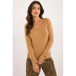 Dámský svetr casual ideální na každý den i do práce. Vyroben z vysokokvalitní směsi materiálů: viskózy, polyamidu a polyesteru, poskytuje pohodlí nošení a trvanlivost. Hladký vzor a klasická délka dělají z něj univerzální kus oblečení. Svetr má dlouhý rukáv s ozdobnými knoflíky na zápěstí, které dodávají jemný elegantní akcent. Výstřih ve tvaru písmene V (serk) zdůrazňuje krk a dodává celku ženský charakter. Skvělá volba jak do kanceláře, tak na každodenní vycházky.
