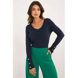 Dámský svetr casual ideální na každý den a do práce. Vyroben z vysoké kvality směsi materiálů: viskózy, polyamidu a polyesteru, zajišťuje pohodlné nošení a trvanlivost. Hladký vzor a klasická délka dělají z něj univerzální kus oblečení. Svetr má dlouhý rukáv zakončený ozdobnými knoflíky na zápěstích, které dodávají jemný, elegantní akcent. Výstřih ve tvaru písmene V (seré) zdůrazňuje krk a dodává celku ženský charakter. Skvělá volba jak do kanceláře, tak na každodenní výstupy.