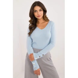 Dámský svetr casual ideální na každý den i do práce. Vyroben z vysokokvalitní směsi materiálů: viskózy, polyamidu a polyesteru, zajišťuje pohodlné nošení a trvanlivost. Hladký vzor a klasická délka dělají z tohoto kusu oblečení univerzální prvek šatníku. Svetr má dlouhý rukáv ukončený ozdobnými knoflíky na zápěstí, které dodávají jemný, elegantní akcent. Výstřih ve tvaru písmene V (lodička) zdůrazňuje krk a dodává celku ženský charakter. Skvělá volba jak do kanceláře, tak na každodenní výlety.