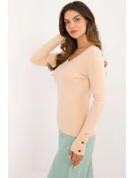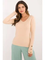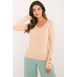 Dámský svetr casual ideální na každý den a do práce. Vyroben z vysoké kvality směsi materiálů: viskózy, polyamidu a polyesteru, poskytuje pohodlí a trvanlivost. Hladký vzor a klasická délka dělají z tohoto kusu oblečení univerzální prvek garderoby. Svetr má dlouhý rukáv zakončený ozdobnými knoflíky u zápěstí, které dodávají subtilní a elegantní akcent. Výstřih ve tvaru písmene V (lodička) zdůrazňuje krk, dodávajíc celkovému vzhledu ženský charakter. Skvělá volba jak do kanceláře, tak na každodenní vycházky.