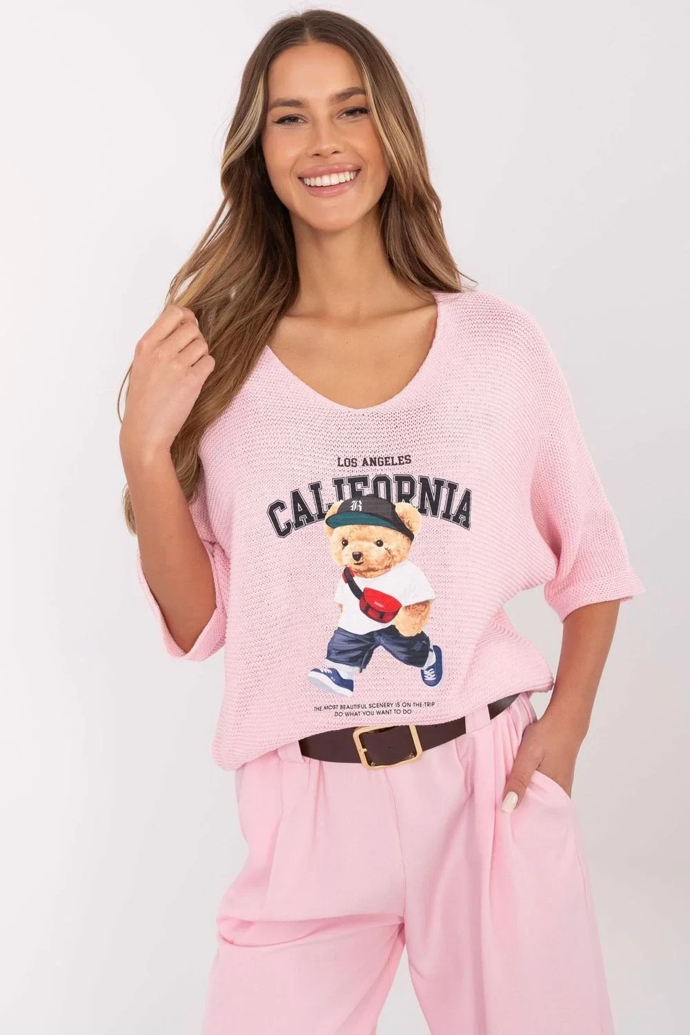 Ležérní dámský svetr nasazovaný přes hlavu, ideální na každý den. Vyrobený z měkké a příjemné směsi bavlny a akrylu, poskytuje pohodlí nošení a odolnost. Standardní délka umožňuje skvěle ladit jak s džínami, tak s sukněmi. Svetr se vyznačuje roztomilým potiskem ve tvaru medvídka s dalšími nápisy, co mu dodává jedinečný charakter. Výstřih do V zdůrazňuje ženský styl a 3/4 rukávy dodávají lehkost a volnost. To je skvělá volba pro ženy, které ocení pohodlí a módní, neokoukaný design.
