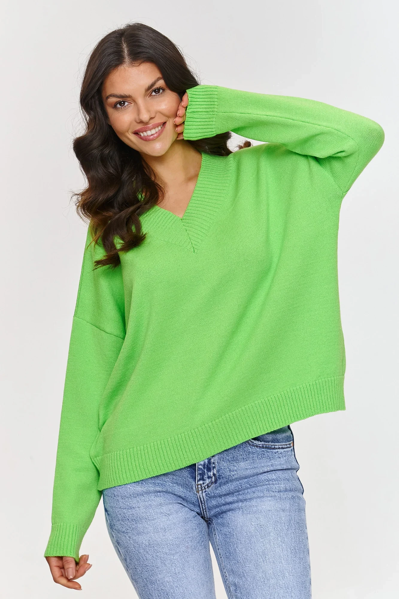 Tento základní svetr je skvělou volbou pro ty, kteří hledají nadčasový oděv, který spojuje eleganci s pohodlím. Vyrobený z vysoce kvalitní viskózy s přídavkem PBT, zaručuje nejen pohodlí nošení, ale také vynikající trvanlivost a odolnost proti mačkání. Výstřih ve tvaru V decentně zdůrazňuje krk, celku dodává lehký a elegantní charakter, volný střih a dlouhé rukávy zase zajišťují, že se jedná o pohodlný kousek oblečení. Pružné lemy na rukávech a dole dodávají moderní vzhled a zajišťují, že svetr dobře drží tvar. Viskóza je materiál, který je příjemný k pokožce, prodyšný a jemný na dotek, ideální na každé roční období. PBT (polybutylentereftalát) je syntetické vlákno, které zvyšuje elasticitu materiálu, zlepšuje jeho odolnost proti vytahování a mačkání. Díky PBT si svetr zachovává svůj tvar déle a je snadno udržovatelný. Díky kombinaci elegantního výstřihu ve tvaru V a elastického materiálu je svetr velmi všestranný. Můžete ho zkombinovat s džíny, sukní nebo elegantními kalhotami, vytvářejícími ležérní nebo formální styly.