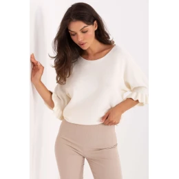 Elegantní dámský svetr standardní délky, ideální jak na každý den, tak i na speciální příležitosti. Vyrobený z vysoce kvalitní směsi viskózy, polyesteru a nylonu, zajistí pohodlí nošení a odolnost. Hladký vzor mu dodává nadčasový charakter a jemné detaily přidávají ženský šarm. Model je vyznačen kulatým výstřihem a 3/4 rukávy zakončené jemným volánem, které zdůrazňují eleganci a lehkost stylizace. Skvělá volba pro ženy, které ocení klasiku v moderním provedení.