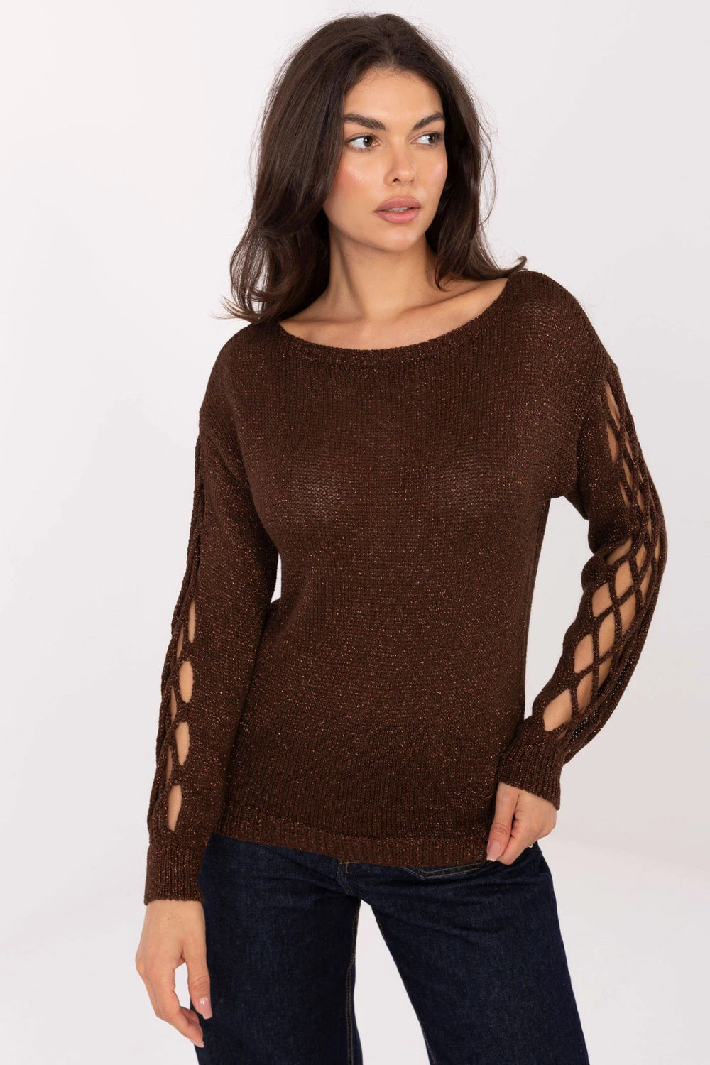 Elegantní dámský svetr standardní délky, vyrobený z vysoce kvalitní viskózy s přídavkem metalizované příze, která jemně leskne a dodává celku výjimečný charakter. Model se vyznačuje moderními výstřihy na rukávech, díky nimž získává klasický tvar moderní akcent. Hladký vzor činí svetr univerzálním a snadno kombinovatelným s ostatními kousky oblečení. Dlouhý rukáv a kulatý výstřih mu dodávají nadčasovou eleganci a zároveň zajišťují pohodlné nošení. Skvěle se hodí jak na každý den, tak i do pracovních stylizací, zdůrazňujíc ženský šik jednoduchým a zároveň efektním způsobem.