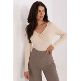 Elegantní dámský svetr vyrobený z pružné směsi viskózy a elastanu, která zaručuje pohodlí a přizpůsobení se postavě. Model má standardní délku, dlouhý rukáv a výstřih do srdce ozdobený dekorativním prvkem vpředu, což mu dodává jemnou eleganci. Svetr je vyroben z pruhované látky s hladkým, dominujícím vzorem, díky čemuž vypadá klasicky a nadčasově. Bez zapínání je tento model jednoduchý a zároveň univerzální. Ideální jak do práce, tak na formální příležitosti.