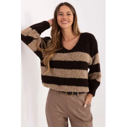 Stylový a pohodlný dámský svetr s volným střihem je ideální volbou na každý den. Vyroben z měkké a příjemné směsi akrylu, polyesteru, vlny, viskózy a alpaky, poskytuje teplo a pohodlí po celý den. Model má standardní délku, dlouhé rukávy a výstřih do V, který jemně zdůrazňuje krk a přidává ženský charakter. Pruhovaný vzor mu dodává módní, ležérní styl, skvěle se hodící do každodenních outfitů. Tento svetr je ideální volbou na volné, každodenní příležitosti, spojující módní vzhled s pohodlím a nadčasovým šarmem.