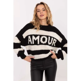 Volný dámský oversized svetr standardní délky, ideální pro každodenní stylizace. Vyrobený z směsi akrylu, vlny, viskózy a polyamidu, poskytuje pohodlí nošení, měkkost a příjemné zahřátí v chladnějších dnech. Model se vyznačuje módním pruhovaným vzorem a nápisem na přední straně, které mu dodávají mladistvý, uvolněný charakter. Dlouhý rukáv a kulatý výstřih zdůrazňují klasický, pohodlný střih a volný oversized střih zajistí plnou volnost pohybu. Svetr nemá zapínání, takže ho lze snadno kombinovat s různými kusy oblečení. Ideální volba pro ženy, které oceňují pohodlí spojené s moderním, ležérním stylem.