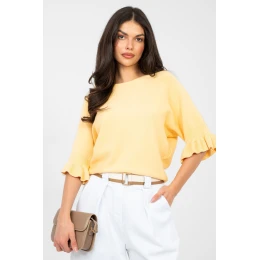 Elegantní dámský svetr standardní délky, ideální jak do každodenního nošení, tak i na speciální příležitosti. Vyrobený z vysoce kvalitní směsi viskózy, polyesteru a nylonu, zaručuje pohodlí a odolnost. Hladký vzor mu dodává nadčasový charakter a jemné detaily přidávají ženský šarm. Model se vyznačuje kulatým výstřihem a 3/4 rukávy zakončenými jemnou volánem, které zdůrazňují eleganci a lehkost stylizace. Skvělá volba pro ženy, které oceňují klasiku v moderním podání.
