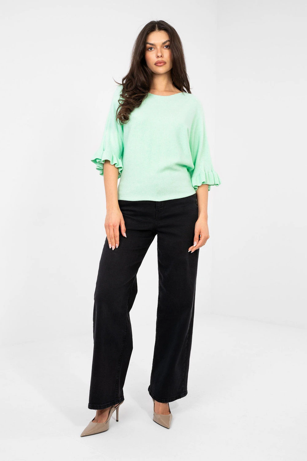 Elegantní dámský svetr standardní délky, ideální jak do každodenního nošení, tak i na speciální příležitosti. Vyrobený z kvalitní směsi viskózy, polyesteru a nylonu, zaručuje pohodlí a odolnost. Hladký vzor mu dodává nadčasový charakter a jemné detaily zase ženský šarm. Model se vyznačuje kulatým výstřihem a 3/4 rukávy s decentním lemem, které zdůrazňují eleganci a lehkost stylizace. Skvělá volba pro ženy, které si cení klasiku v moderním provedení.