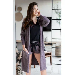 Hřejivý dlouhý svetr z měkkého úpletu s volným pohodlným střihem. Svetr bez vázání, dlouhé rukávy, kapsy na bocích.